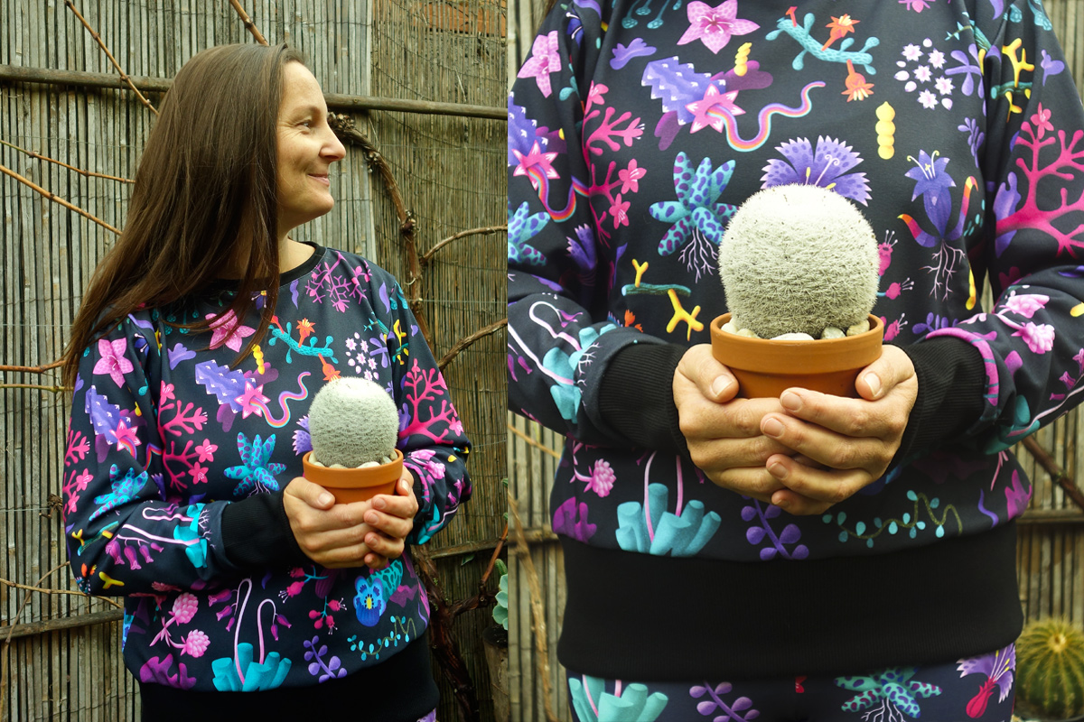 Krátká mikina ze 100% bavlny (teplákoviny) z lehčího materiálu (220 g/m2). Sublimační tisk je barevně věrný a stálý. Střih je rovný, s širokými rukávy. Mikina je volnější (nevypasovaná). Výstřih je oválný. Náplety na rukávech a na spodku mikiny jsou z černého bavlněného žebrovaného nápletu. Barevný podklad mikiny je černý.